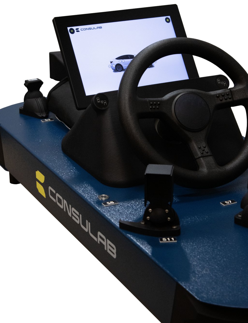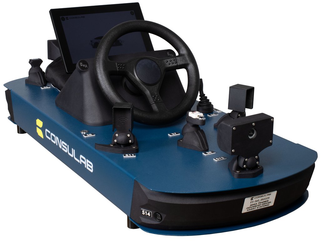 Features | The trainer is a scale model, providing the visual cues of where the components are typically found on an actual vehicle, helping the students to recognize design function and orientation. It incorporates a 10” X 6” tablet display with EXPLORE or DRIVE mode viewing options. These choices allow either an overall view of a composite vehicle illustrating the location of all the ADAS sensors. |